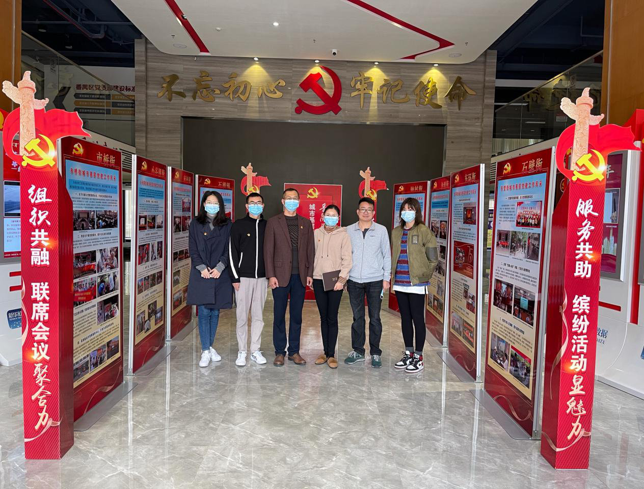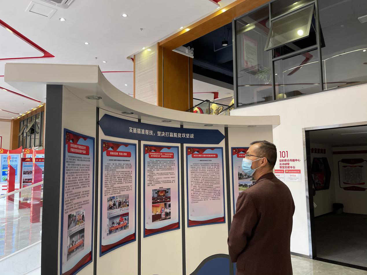 本次展覽設(shè)在東環(huán)街黨群企綜合服務(wù)中心大堂,主要聚焦番禺區(qū)近年來城市基層黨建工作的主要成效和特色亮點,展示了番禺區(qū)各鎮(zhèn)街的基層黨建工作風(fēng)采,黨組織實施精準(zhǔn)扶貧的工作紀(jì)實,以及番禺區(qū)2020年抗疫一線工作的點滴。最后,大家還通過展覽重溫了習(xí)近平總書記經(jīng)典語錄。