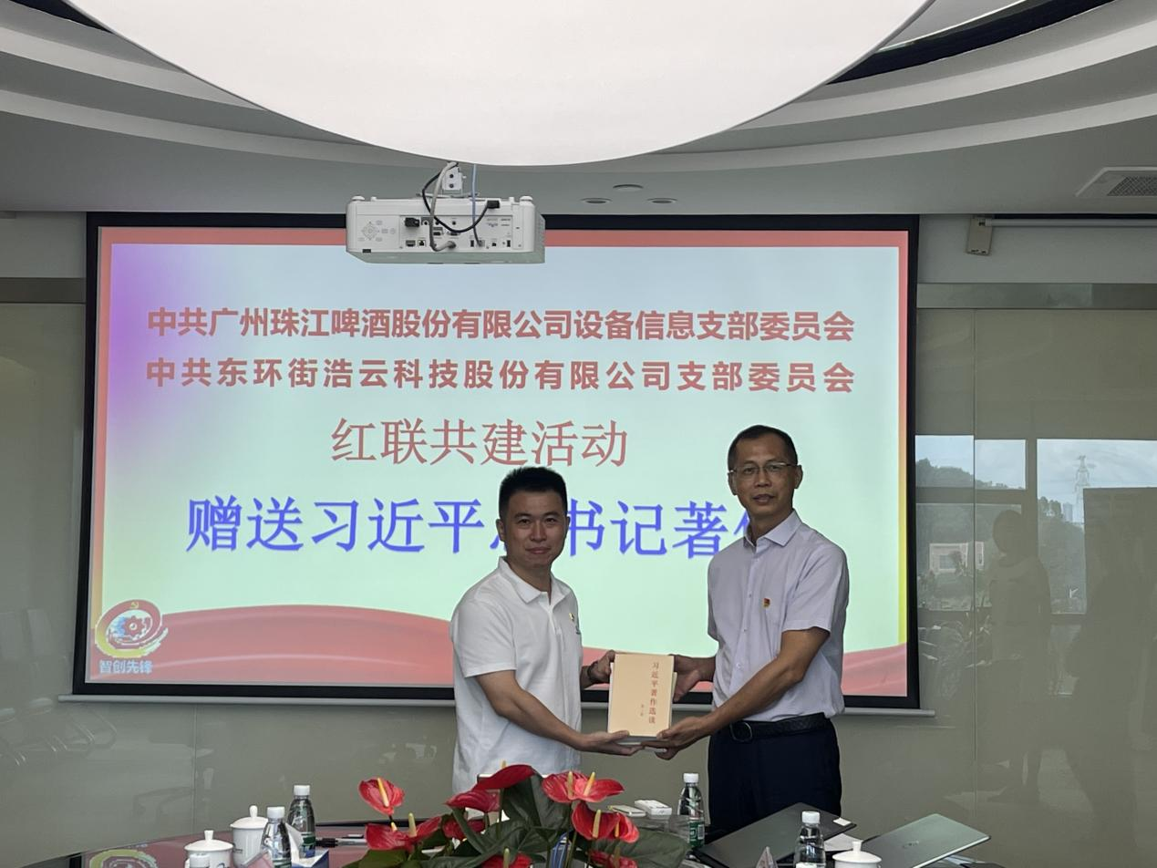 曾海濤總會(huì)計(jì)師代表設(shè)備信息黨支部向浩云科技黨支部贈(zèng)送習(xí)近平總書(shū)記著作及相關(guān)學(xué)習(xí)讀本,并提出兩個(gè)黨支部要以簽訂共建協(xié)議為契機(jī),深入學(xué)習(xí)貫徹習(xí)近平新時(shí)代中國(guó)特色社會(huì)主義思想,充分發(fā)揮共建雙方優(yōu)勢(shì),定期交流黨建工作經(jīng)驗(yàn),互學(xué)互促,共同提高黨建工作水平。同時(shí)希望借力浩云科技在計(jì)算機(jī)信息系統(tǒng)集成、物聯(lián)網(wǎng)智能化工程等方面的技術(shù)優(yōu)勢(shì),在珠江啤酒智能制造和綠色化工廠的基礎(chǔ)上,搭建未來(lái)雙主業(yè)高質(zhì)量發(fā)展共享平臺(tái),通過(guò)黨建與業(yè)務(wù)聯(lián)建,共同解決關(guān)鍵核心技術(shù)問(wèn)題等任務(wù),將黨建互促互進(jìn)的政治優(yōu)勢(shì)將更好地轉(zhuǎn)化為發(fā)展優(yōu)勢(shì),進(jìn)一步推動(dòng)企業(yè)高質(zhì)量發(fā)展取得新成效、再上新臺(tái)階。