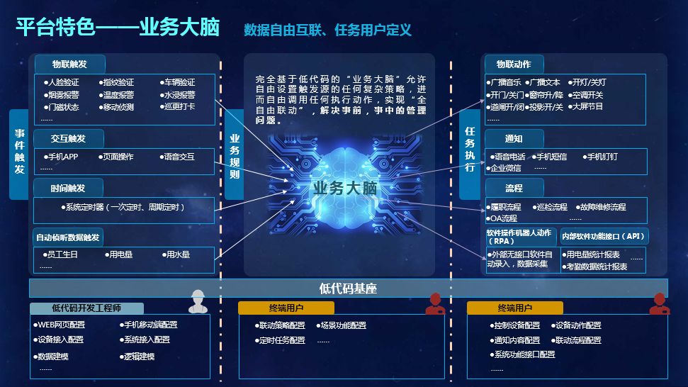 浩云智慧樓宇解決方案是以低代碼智慧物聯(lián)管理平臺為核心,平臺以低代碼引擎為底座,標準化物模型支撐各廠商設備統(tǒng)一接入,實現(xiàn)全面控制、聯(lián)動。平臺可讓原本各自為陣的所有子系統(tǒng)在平臺的支撐下形成有機整體,并可以在平臺大腦的支持下實現(xiàn)自動化、智能化運行。從而打破信息孤島,為大樓運營管理及數(shù)字化能力提升提供先進技術手段。有效提升管理效率、減少人力投入、可對各職能部門業(yè)務賦能、實現(xiàn)資源共享、降本增效。